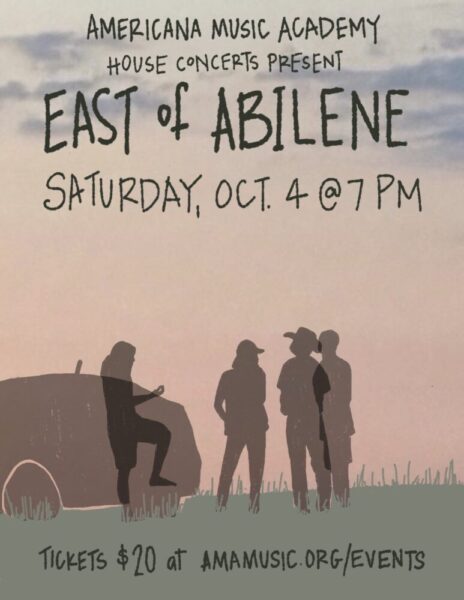 East of Abilene, a newly formed Lawrence folk band, is making their a mark on the Lawrence live music scene. Just back from Winfield, join us for a memorable evening of music live in the living room at Americana Music Academy.