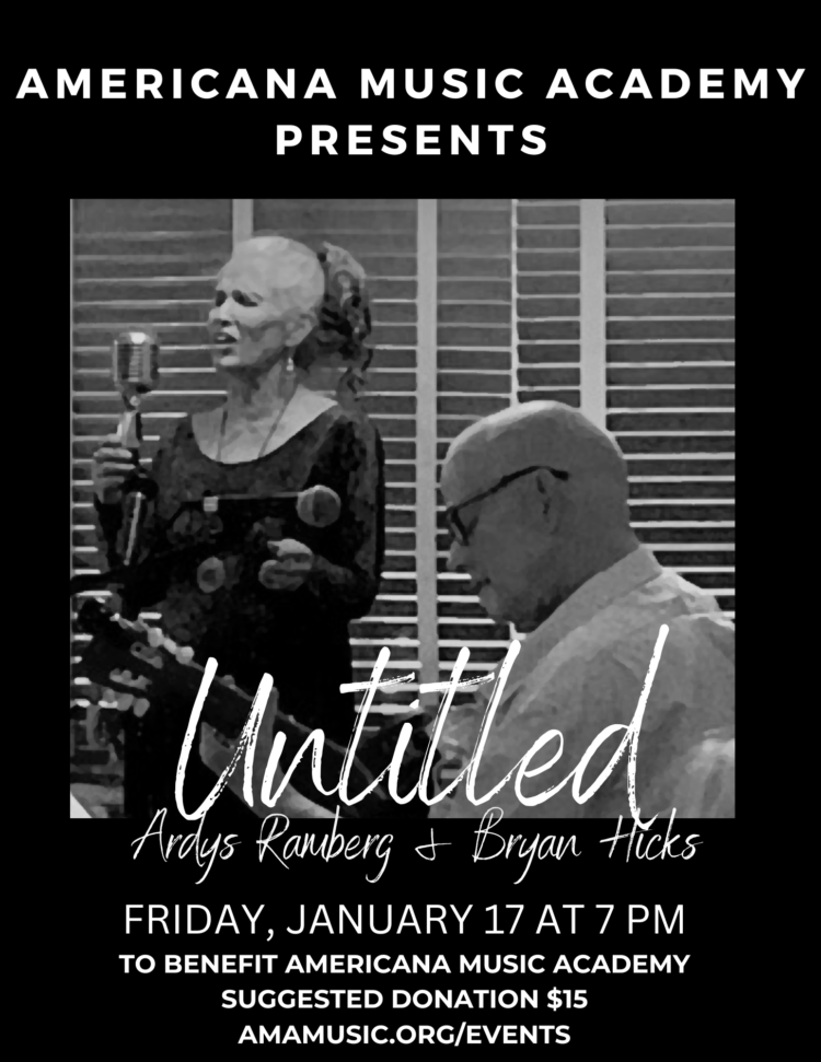 Join us for an eclectic evening of jazz standards, Bossa Nova, show tunes, Leonard Cohen, and other favorites of Ardys and Bryan. Proceeds to partially benefit Americana Music Academy. Suggested donation $15.